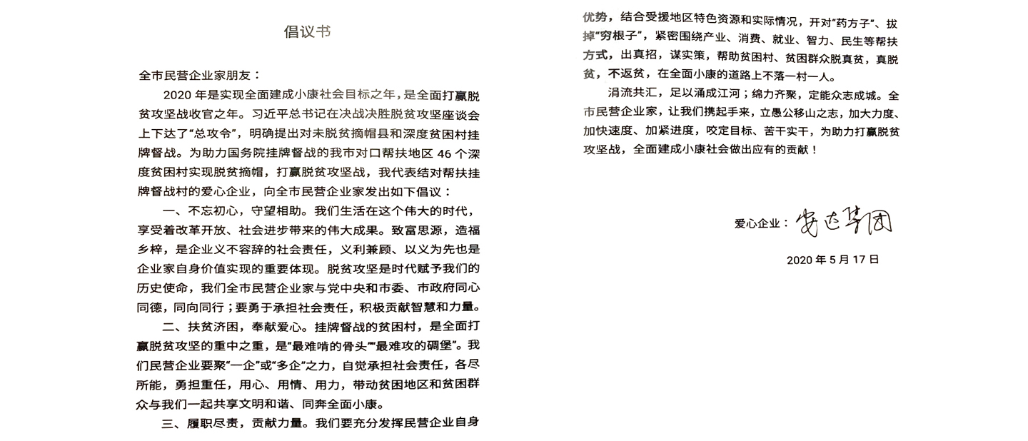 啟動(dòng)儀式上,天津愛(ài)心企業(yè)以“云聚力”方式發(fā)出助力貧困村摘帽行動(dòng)倡議書(shū),16個(gè)區200余家企業(yè)進(jìn)行“云簽約”。安達集團作為一家擁有32年歷史的優(yōu)秀企業(yè),在黨委書(shū)記、董事長(cháng)崔洪金的帶領(lǐng)下,長(cháng)期堅持慈善公益活動(dòng),近年來(lái),響應政府號召,特別關(guān)注脫貧攻堅助困工作,通過(guò)捐資捐款、購買(mǎi)扶貧產(chǎn)品等方式助力脫貧攻堅工作,今后安達集團還將繼續發(fā)揮民營(yíng)企業(yè)自身優(yōu)勢,緊密?chē)@產(chǎn)業(yè)、消費、就業(yè)、民生等幫扶方式,助力貧困村、貧困群眾真脫貧。